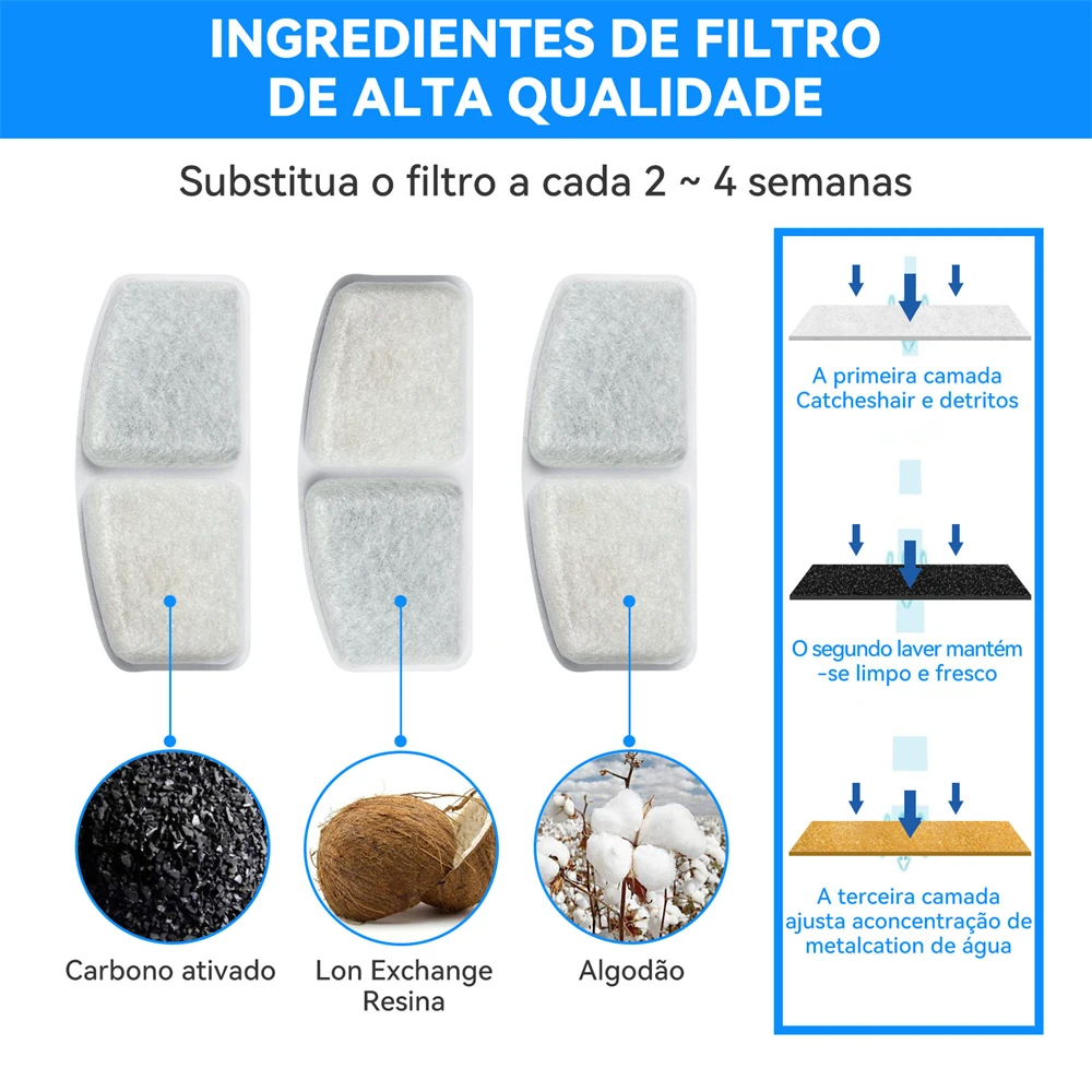 Resina de troca: O magnésio e o cálcio da água são removidos e ela é transformada em água adequada para gatos (água macia) cuja dupla é reduzida. Carvão ativo de alto desempenho: Absorve odores e bactérias.